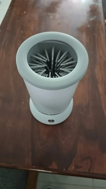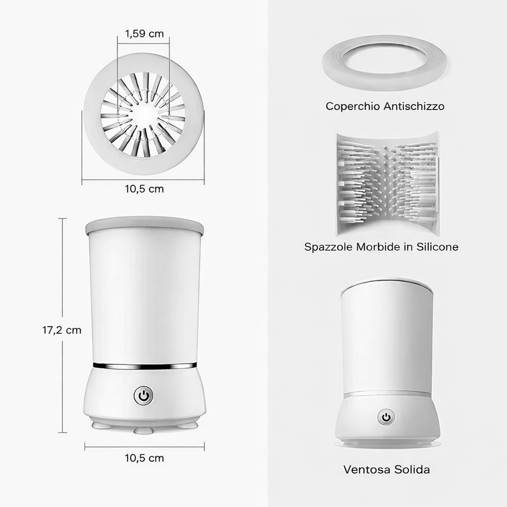 È semplicissimo: basta rimuovere la spazzola interna in silicone e sciacquarla sotto l'acqua corrente. Il contenitore può essere lavato in pochi secondi e igienizzato per l'uso successivo.